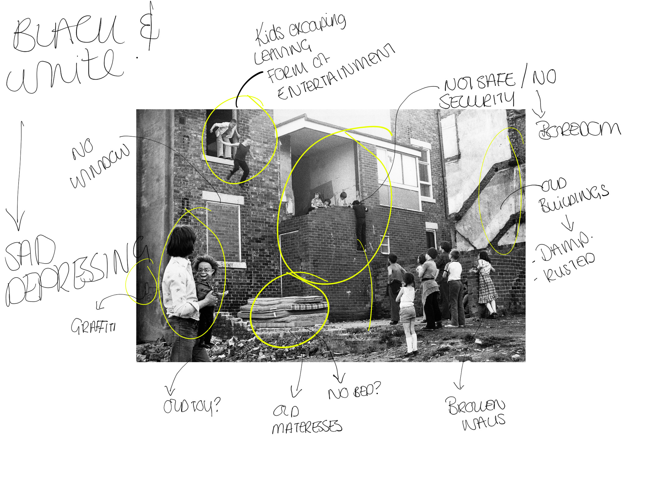 There is loads more annotation to this and this is displayed in the photo the last thing I want to mention is the colour. I think for poverty the idea of black and white really makes it stand out and makes it more depressing and shows the sad side to poverty and this is definitely something I would use within my designs as it makes it so powerful and tells a story.