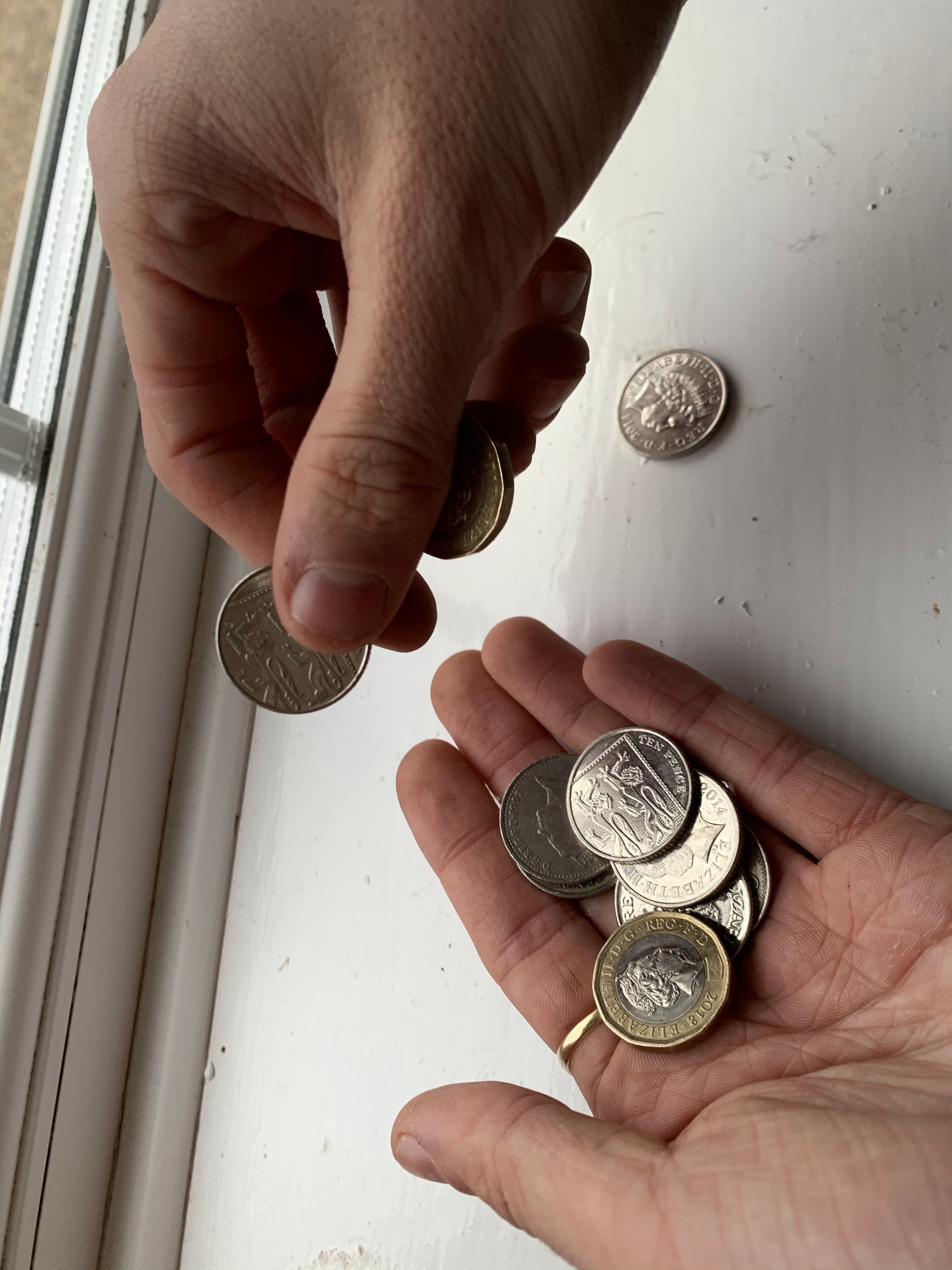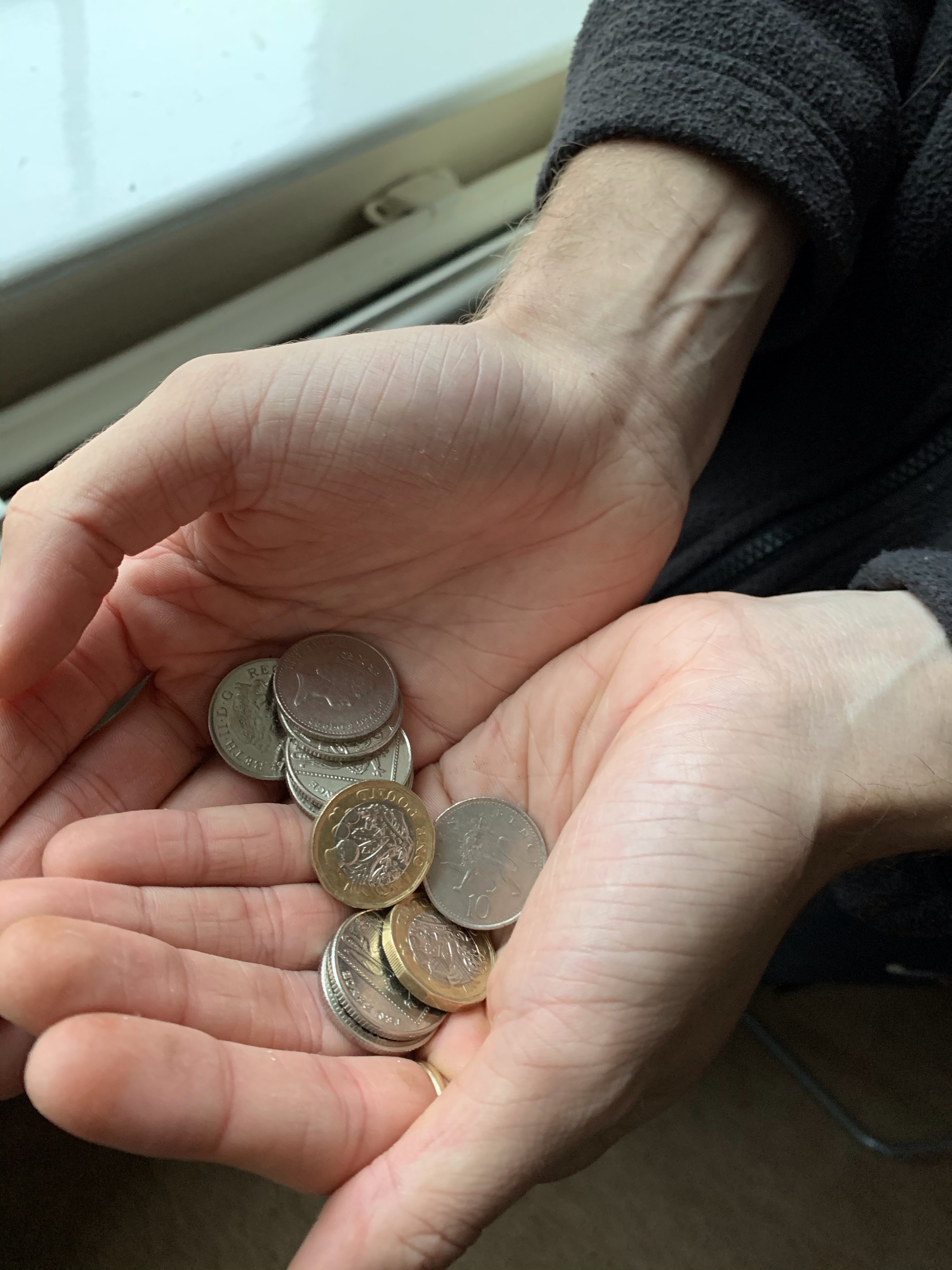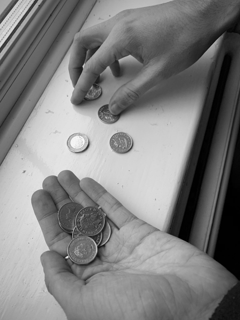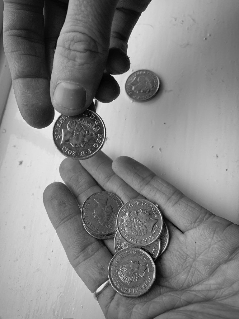 I wanted to photograph someone holding the money but not begging for money, to indicate people living on lose change. Therefor explains the next photograph. Within this photograph the subject displays him holding some loose change, and this spreads over both his hands. this indicates looking for loose change for essentials, and not begging or really asking for help.