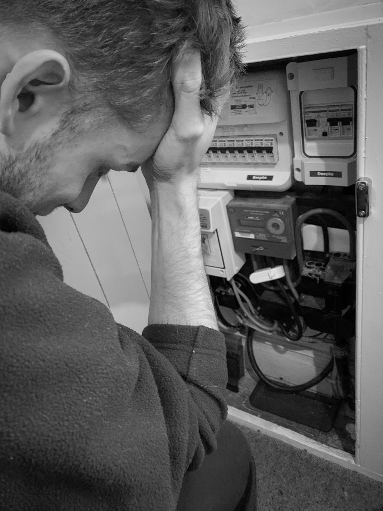 I then thought that the first photo did not show the emotion that comes along things like this not working. Some of us take gas and electric and heating for advantage and do not actually think about the cost and the issues that some people face. The top image displays a problem with the metre and the subject trying to fix it, then the bottom one is almost displaying the after effect it has on the subject because it cannot be fixed. I made jack put his hand on his head as this indicated a sense of struggle and desperation. I wanted to portray through my photography the sense of alone and the need of help and this was going to be continued through all the photographs I would off taken.