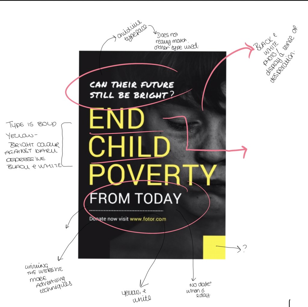 I then found some on google that I thought would be great to analyse with the iPad to pick out key things that could inspire me in my designs. There was design that sin pried me so much and stood out in comparison to the other designs. This poster below is about child poverty but the way in which its designed is what inspired me so much. The way in which they have used a black and white photo of a child that portrays emotion, and this is black and white creating a deeper meaning stands out more and portrays a story of life in poverty. They then use a bright colour of hope which is the yellow, and this makes the writing not only stand out and catch the eye against the black and white but also allows the page to have hope and happiness through a negative design and meaning. They then have a child like type and this makes it more personal and connects with their audience in portraying poverty.