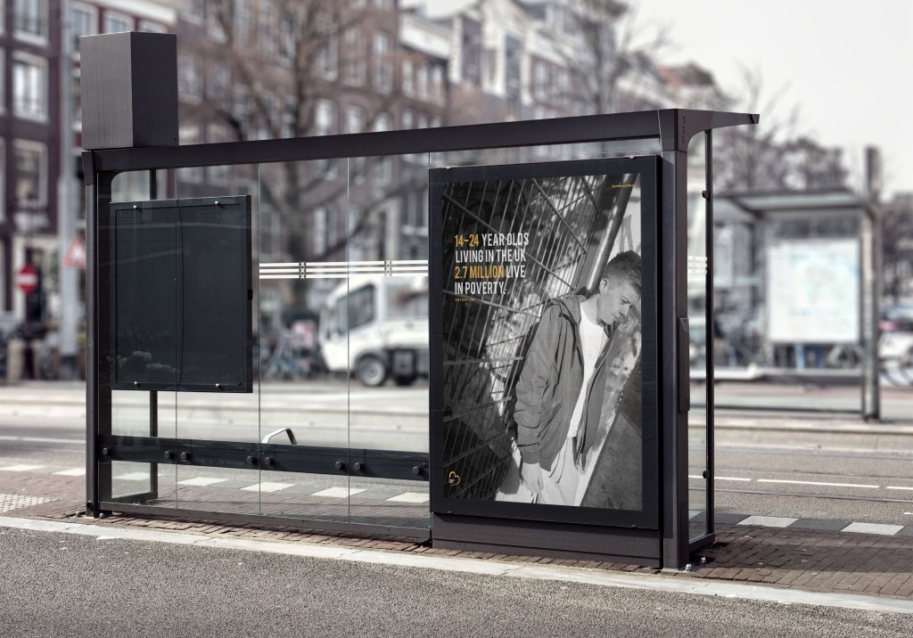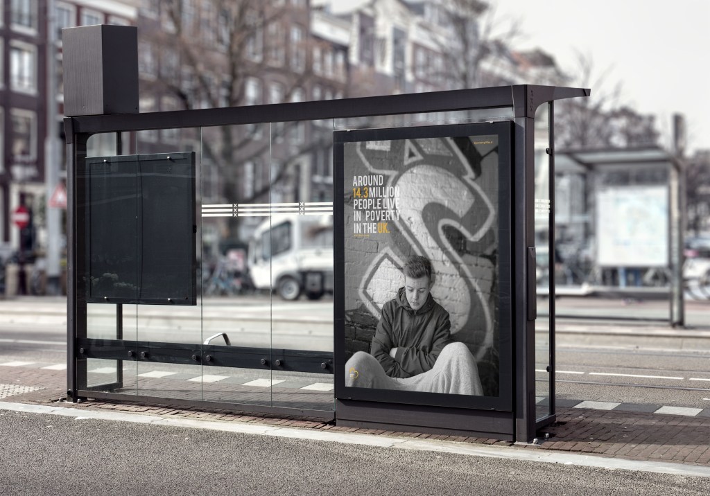 I could not do poster 3 in a billboard as it was landscape but square landscape, it wa impossible to find a mock up that actually fitted it. I then thought that one would more likely be in an underground display as those ones are on a larger scale. The worry for me was that the posters would not be seen from a far due to the black and white, however what I think makes the poster pop is the colour orange through the type and logo, without that I do not think it would work as well. The images are clear and shine light on the fact of poverty in the UK and are clearly seen even when black and white.