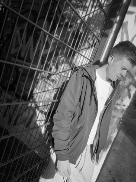 The image within this poster features my brother leaning up against a gate. What I think makes this photo work so well is the angel of the photography, you can see Danny’s emotion and the background he is surrounded in. Again, making this photo black and white allows the photo to portray emotion through the design; the original photograph displays sunlight and even with the black and white you can see the sunshine, and this reflects on the subject and the background well.