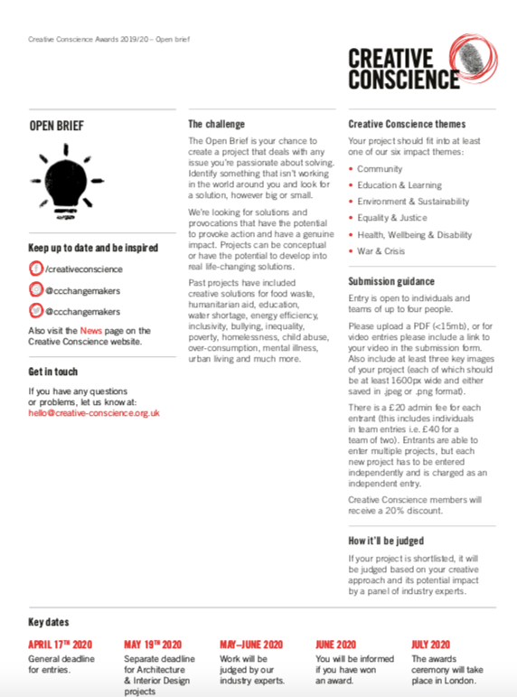 The open brief is our chance to a create a project that-deals with any issues we are passionate about solving. Identify something that isn’t working in the world around you and look for a solution. Creative conscience are looking for solutions and provocations that have the potential to prove action and have a genuine impact. Projects can be conceptual or have the potential to develop into real life-changing solutions. e.g food banks, food waste, homelessness, education etc and much more.