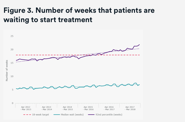 In March 2018, only 87% of patients had a treatment waiting time of less than 18 weeks.