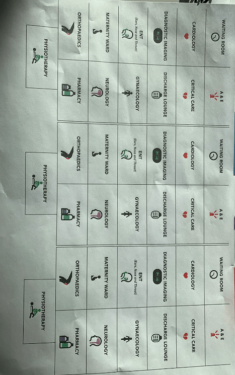 Jacob created the outline and the map for the hospital with names of the rooms and another one with no rooms on therefore people could stick the right ones on, a this would be the main focal point for the design. Sam created the small icons that people would stick on, and then when I returned from being ill I sat them all down and worked out a plan in order of what I had to to do next. I personally did not think this design was amazing and could be developed a lot due to the dark dull colours used.