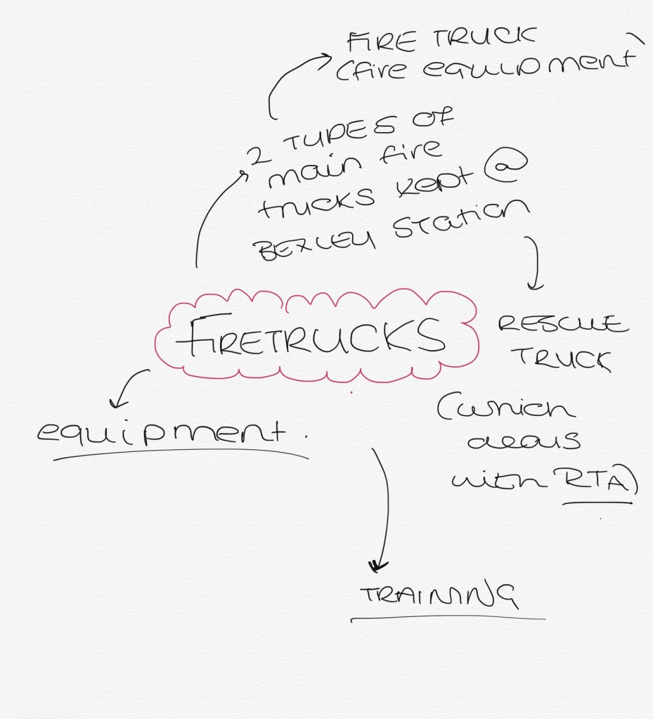 the first mind map was quite short and sweet but displayed the different fire trucks, being fire and rescue and what the purpose of each is. This then linked onto the equipment and the training for the trucks.