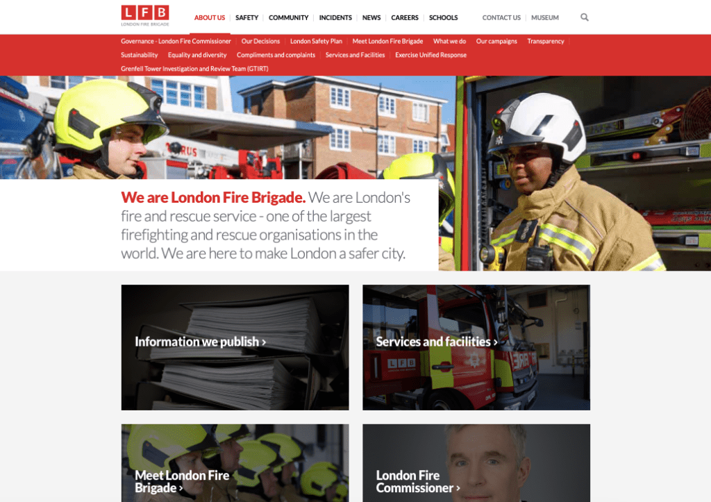 The website is full of key information and images to portray the LFB and what they are about. Within the menu bar they portray about us, safety, community, incidents, news, careers and schools. The first page you see when you go onto the website is vibrant , consistent of the colour red throughout. The images are quite friendly not to graphic and display what London Fire Brigade are all about.