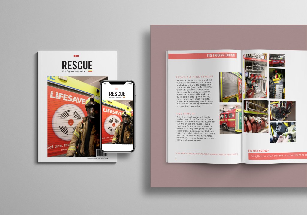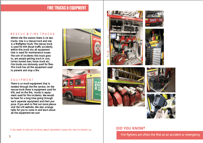 I wanted to end this magazine quite quickly and not go on forever due to the target audience and after a while they wouldn’t continue reading. So we continue the title theme again with a red box with the title fire trucks and equipment and this is the category for the next DPS. I used a lot of negative space in this design and wanted to almost mix it up a bit in style of placing images. So on the left hand page I started with rescue and fire trucks and gave a brief explanation and then underneath equipment. The issue with this topic is that fire fighter information and truck information could generally go on forever and its really complex therefore knowing the audience would be schools kids (secondary school kids) I just wanted a brief explanation then I would add links elsewhere to find out more.
