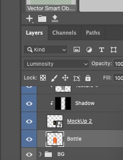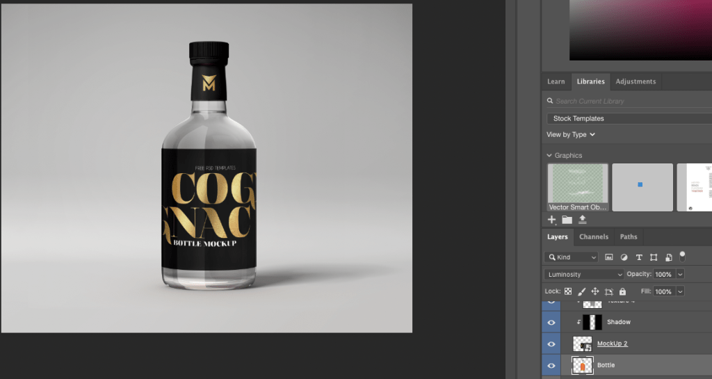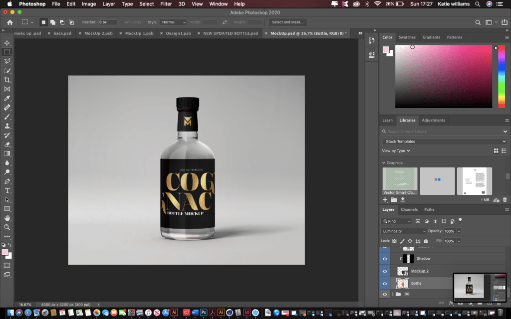 As you can see this makes the bottle clear and reflects through the colour that the background is which in this case is grey, making the liquid appear clear. I chose this because it related to my flavour for a clear gin, and I could then create whatever label and design and not worry about the colour of the liquid.