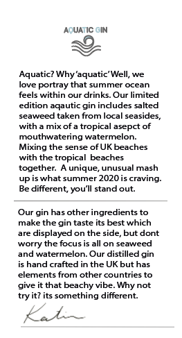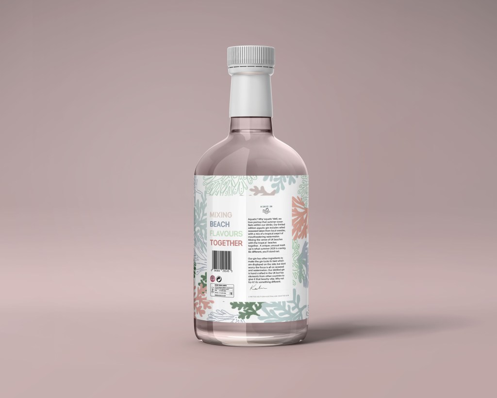 I wanted to add something to make the design link to front even more, and to make it aware of the brand, On the front of the bottle sits the AQUATIC GIN logo on the lid, but then there is nothing on the back as I wanted to make it visible that is was the back. Therefore I thought about adding the brand logo at above the writing to indicate the brand and it also made sense with what I was writing about.
