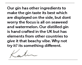Below is what the writing is that is on the bottle of gin. The top is more about the aquatic gin, and then under the line is ingredients. It’s describing being different, mixing unusual things and the story of the beach and craving summer. I decided to add a line between the two so people would actually read it, personally when there is load of type I find it so difficult to read it and I get bored, adding this line made it two seperate paragraphs advertising the gin in different aspects.
