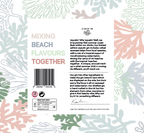I said previously when creating the first ever design, with the poster aspect I thought of the phrase ‘Mixing beach flavours together’ and I wanted to use this on the back of the label as then when I created another adevrtising poster there would be a link. I think its a simple, sort and effective way of expressing my story through the gin and makes it link well with the flavours and thats why I decided to use it on the back label design.