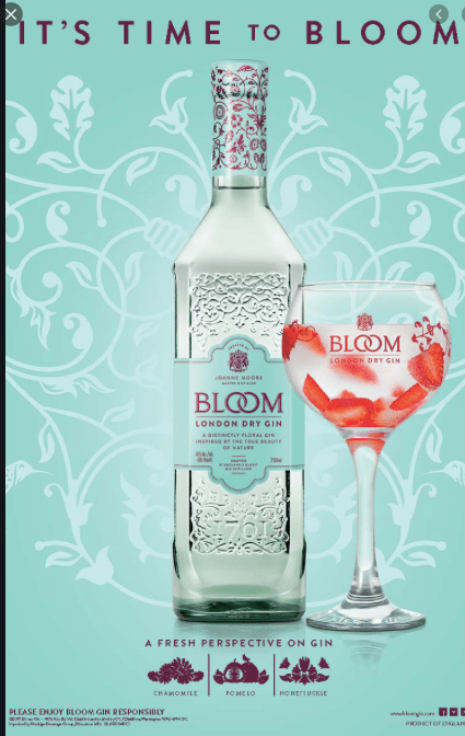 This one below is slightly different to the others as more design elements have been involve to showcase their message. They have used a variety of patterns to match the word Bloom within the design, with the floral pattern throughout. Unlike most gin adverts they display a gin bottle with the logo on it and this gives the audience an idea of the bottle and the way in which the drink can be drunk. It gives the audience an idea of how they could drink the drink, and portrays the imagination. It is such an appealing design and makes you want to drink the drink and visualise sitting on a bench and thinking of the way you can taste the drink and thats the perk of this design.
