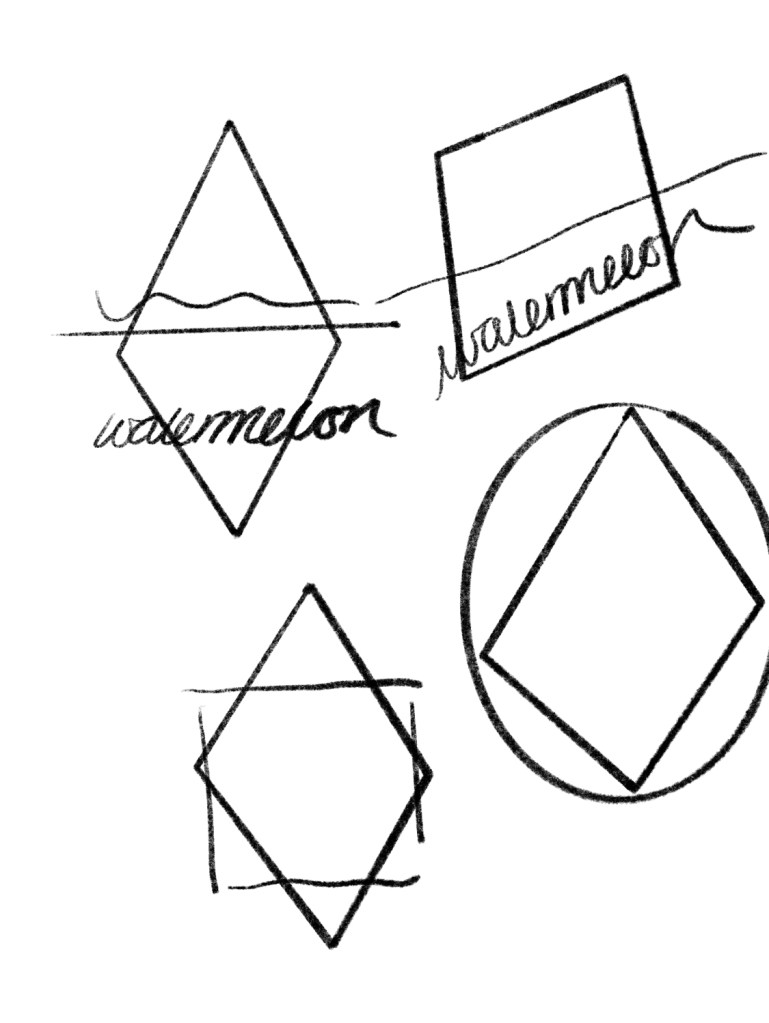 Below is the firsts of the design I did. As you can see it’s awful and really rough sketches, at first I did a lot more in detail sketches as they were developing ideas however now that I reached a design I sort of knew in my head how I wanted it to look. I thought of using a more unique shape than your standard shape for gin bottles. I sketched diamonds a slanted square, mixed them together and a circle. I knew I wanted the watermelon word to almost look like water melon therefore thats why its in italic within these sketches. The scribble at the top of each little design portrays where the sea weed type face would sit.