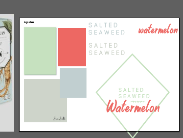 From the sketches, I found the diamond design worked the most for me therefore wanted to continue with this idea. I find it easier to portray the different shades of colours I could use on illustrator as thats how they would be displayed digitally , I thought of the words so seaweed is obviously green, but I wanted it to be a soft pastel sort of feel. I then thought about sea salt which is a colour by it self this blue almost grey appeal and then obviously the water melon colour (the colours I used within the entire design are displayed in the screenshot below)